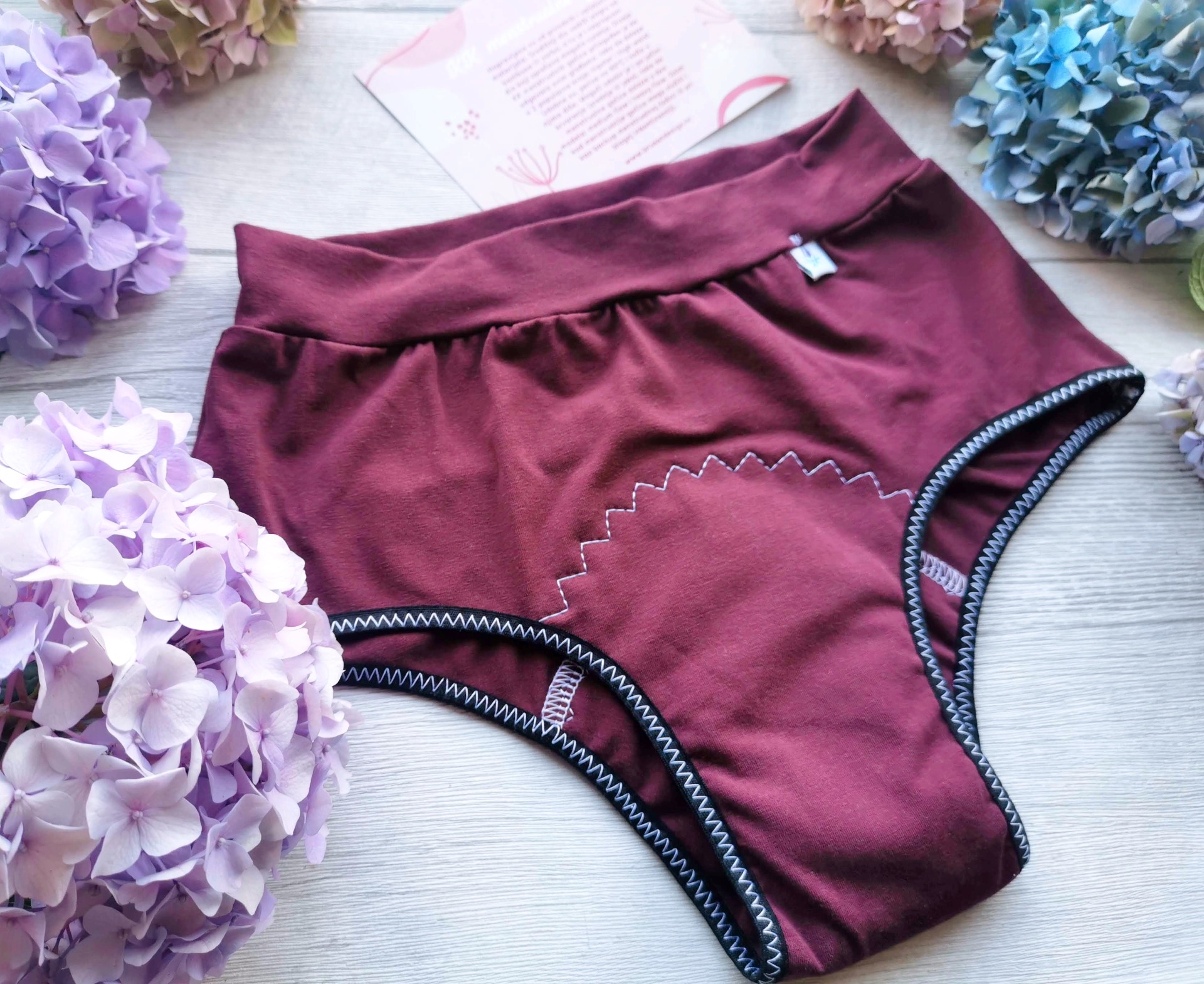 Kényelmes, magas derekú menstruációs bugyi természetes anyagokból, amely biztonságos és diszkrét védelmet nyújt a ciklus napjain.